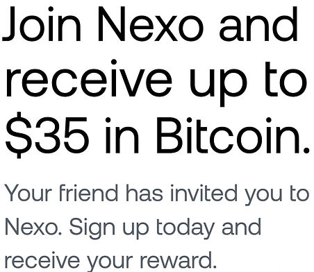 📍Une seule offre promotionnelle est disponible chez Nexo, et elle passe uniquement par un lien de parrainage. Afin de vous éviter de chercher un parrain fiable, je vous partage mon propre lien. Vous pouvez l'utiliser car nous garantissons sa validité. Une fois les conditions remplies, vous obtiendrez votre bonus de 35€.